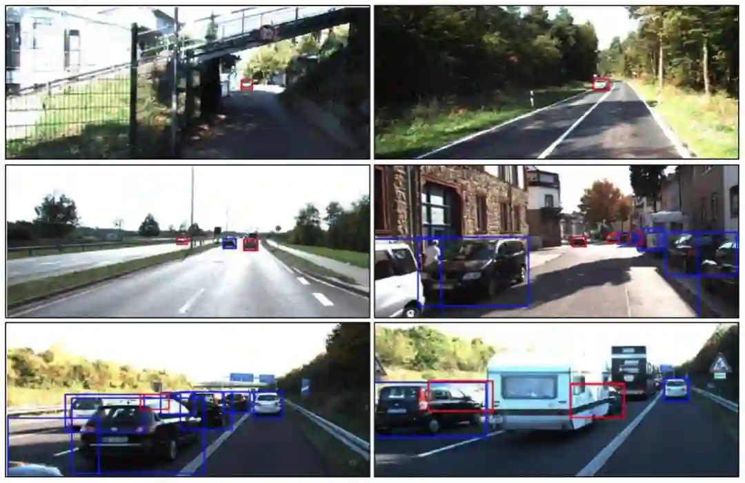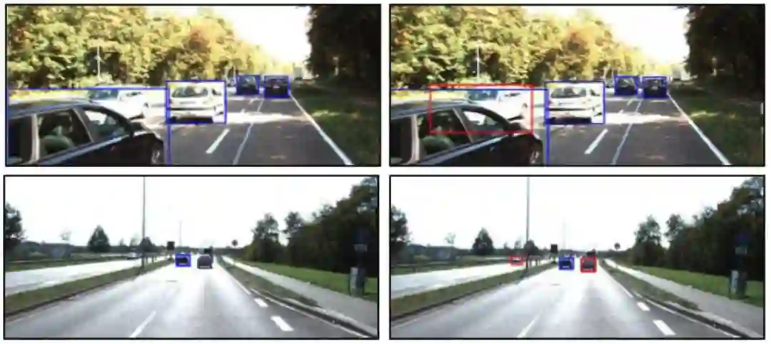 图1:在KITTI上对基线未增强数据(左)和我们提出的方法(右)进行目标检测的样本示例。蓝色方框表示正确的检测结果,红色方框表示基线法遗漏的、但通过我们所提出的基于传感器的图像增强方法能够检测到的结果。