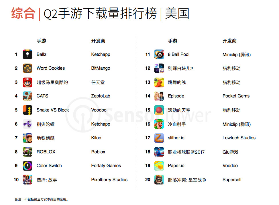 从美国Q2手游下载量综合排行榜来看,有五款来自亚洲的手游进入Top20排行榜。日本任天堂的《超级马里奥酷跑》排在第三位,中国腾讯开发的《8 Ball Pool》和《冷血射手》排在第11位和第16位,而中国的猎豹移动开发的《别踩白块儿2》和《滚动的天空》则排在第13位和第15位。