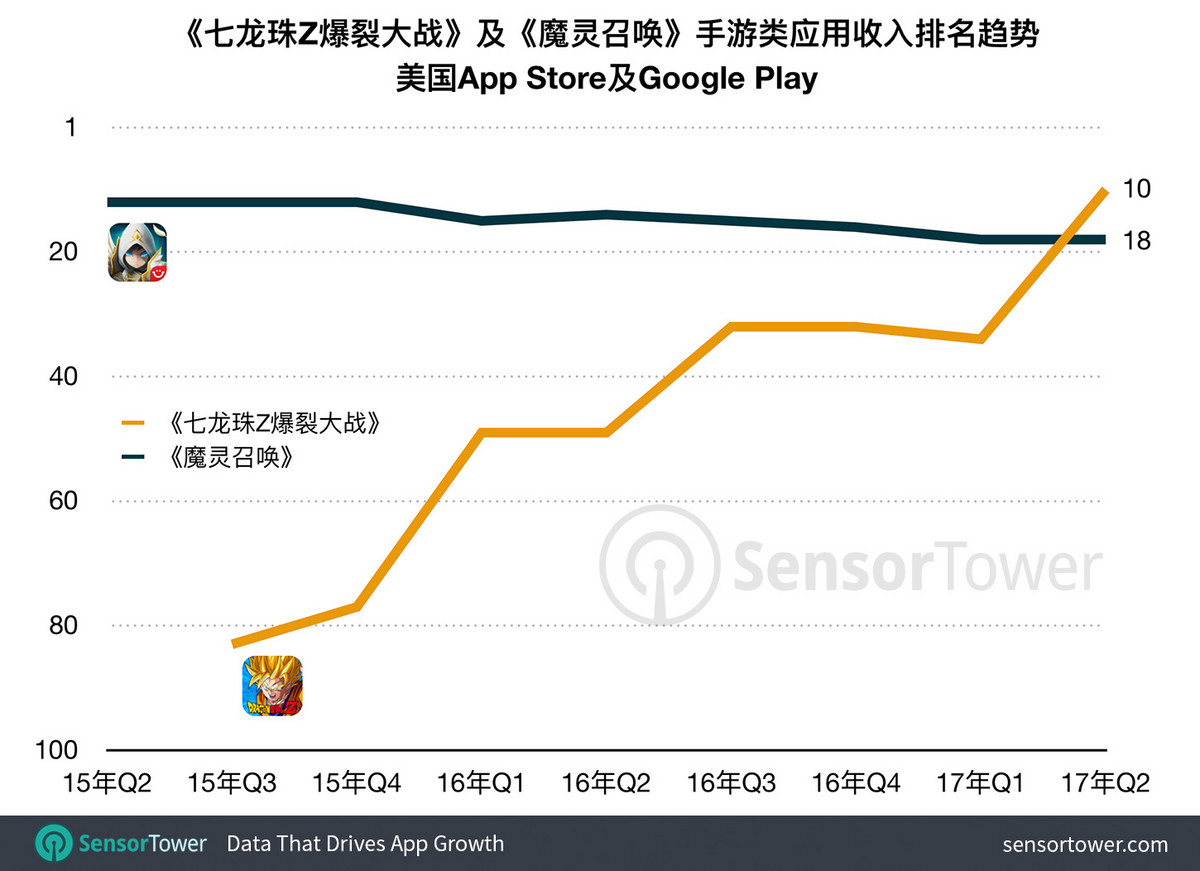美国Q2榜单上另两款亚洲制造为日本万代南梦宫的《七龙珠Z爆裂大战》和韩国Gamevil的《魔灵召唤》。虽在日本的总体收入量最多,《七龙珠Z爆裂大战》IP仍然倍受美国及全球七龙珠迷的长期亲睐。