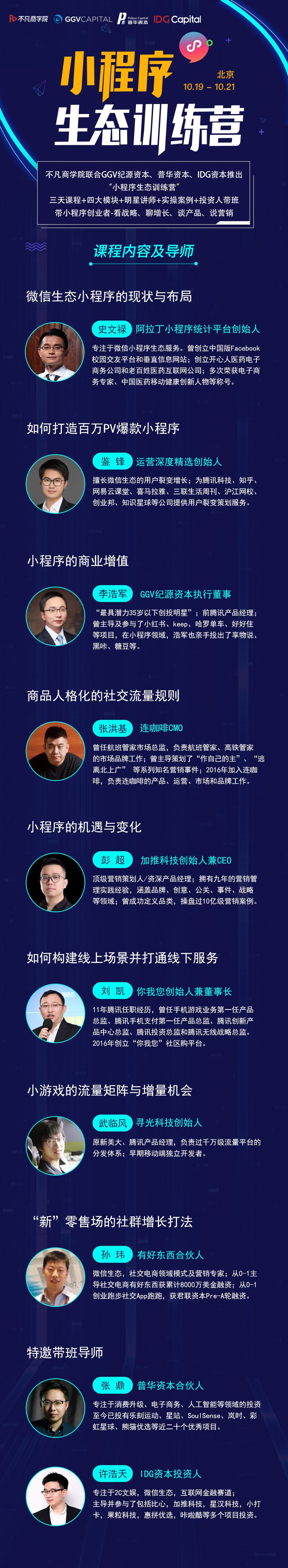 10月19日-21日,不凡商学院联合GGV纪源资本、普华资本、IDG资本推出为期三天的“小程序生态训练营”,共同打磨出:“三天课程+四大模块+明星讲师+实操案例+投资人带班”的重磅课程,本次课程吸引了众多优秀小程序实操者报名,非常火爆。
