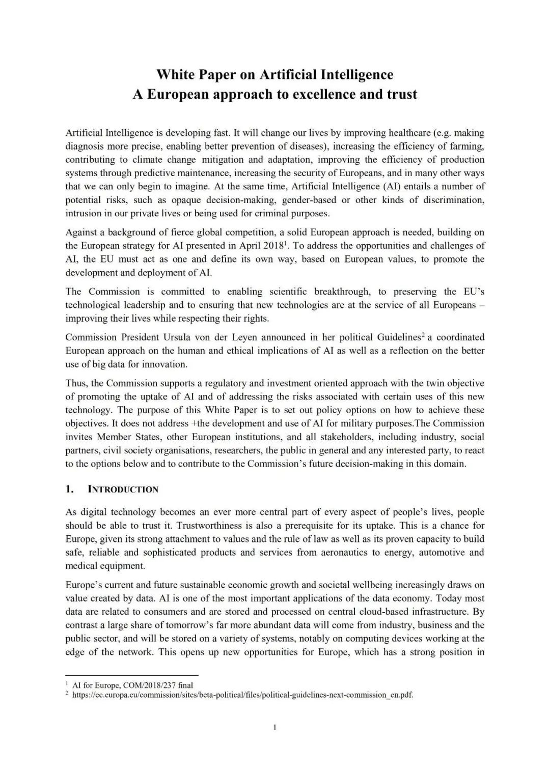 白皮书指出,人工智能 (AI) 是一项战略性技术,有益于社会、公司和个人。AI以人为本,基于道德,可持续发展,尊重最基本的权利和价值。AI带来的效率和生产率不仅能够提升欧洲的产业竞争力,提升人们的生活福祉,还能够有效应对气候变化、环境退化、人口变化、民主权益、社会犯罪等一些急迫解决的社会问题。