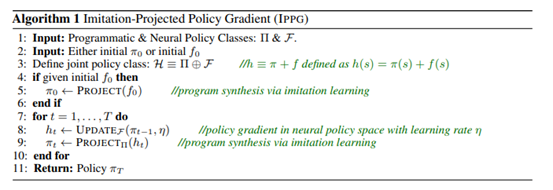 作者提出了模仿预测策略梯度(IPPG),这是一种用于学习策略的算法框架,这些策略以结构化编程语言简洁地表示。与神经政策相比,此类计划政策可以更具解释性,可推广性,并且易于进行形式验证;然而,为计划政策设计严格的学习方法仍然是一项挑战。IPPG,作者对这一挑战的回应,基于三个见解。首先,他将学习任务视为策略空间中的优化,模拟所需策略具有编程表示的约束,并使用“提升和项目”视角解决此优化问题,该视角采用渐变步骤进入无约束策略空间然后投射到受约束的空间。其次,将无约束的政策空间视为混合神经和程序化表示,这使得能够采用最先进的深度政策梯度方法。第三,通过模仿学习将投射步骤作为程序综合,并利用当代组合方法完成这项任务。最后提出了IPPG的理论收敛结果,以及三个连续控制域的经验评估。实验表明,IPPG可以明显优于现有技术