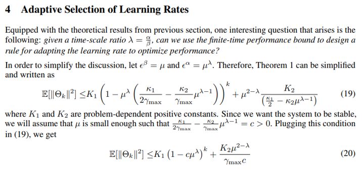作者研究了两种时间尺度的线性随机近似算法,可用于模拟众所周知的强化学习算法,如GTD,GTD2和TDC。其给出了学习率固定的情况下的有限时间性能界限,并获得这些界限的关键思想是使用由奇异摄动理论驱动的线性微分方程的Lyapunov函数(Lyapunov function motivated by singular perturbation theory for linear differential equations)。并使用边界来设计自适应学习速率方案,该方案在实验中显着提高了已知最优多项式衰减规则的收敛速度,并且可用于潜在地改善学习速率在前期改变的任何其他时间表的性能。确定的时间瞬间。