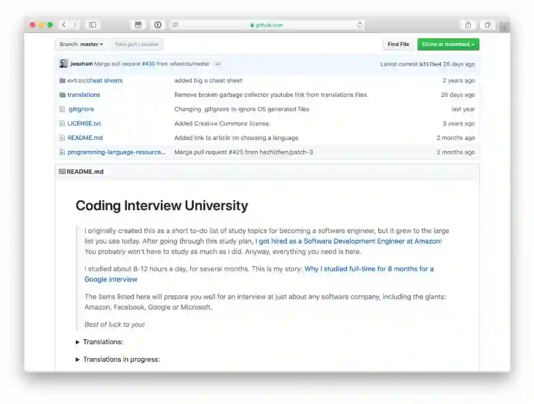 在学习的过程中,他开始接触大量与编程相关的知识与教学资源,秉着前人栽树后人乘凉的精神,John 在 GitHub 上开源了这份学习指南,并将其命名为Google Interview University(现已更名Coding Interview University)。