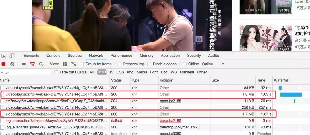 上面我们描述了视频格式的不同,接下来我们要说的是第一张图中的视频加载是浏览器来控制的,通过给 video 的 src 属性配置视频地址,触发播放之后浏览器就会开始下载了,JS干涉不了。而 Youtube 的视频加载是通过JS来控制的,各位可以再次看下第二张图的网络请求类型:xhr,足以证明这一点。