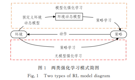 强化学习又称增强学习,在学术界对 RL与统计学、优化 理论和其他数学学科的互动研究有了突破后,RL 逐渐成为 了各 领 域 的 研 究 热 点[1]. 随 着 深 度 学 习 (DeepLearning, DL)[2]的兴 起,融 合 深 度 神 经 网 络 和 RL 的 深 度 强 化 学 习 (DeepReinforcementLearning,DRL)[3]技术的研究和应用日 益增多. RL是一种不同于监督学习的学习方式.监督学习通过 外部提供的标注数据集进行学习,每一个样本都是训练中的 “监督者”[4].而 RL中并不存在这样的“监督者”,因此 RL提 出了奖励信号这个概念.它与监督学习中的监督信号不同, 为了考虑智能体(agent)整体的累积收益,它是 被 延 迟 反 馈 的.同时,监督学习的训练数据之间一般是独立的,而 RL处 理的是序贯决策问题,每一步在顺序上都具有依赖关系. RL也是一种不同于无监督学习的学习方式.无监督学 习的主要目标是寻找未标注数据集中隐含的结构关系,而 RL 的目标是最大化累积收益.同时,无监督学习没有 RL 的奖 励信号,其数据之间一般也是独立的. 在实际应用中,根据agent是否通过与环境交互获得的 数据来预定义环境动态模型,将 RL 分为模型化强化学习和 无模型强化学习[5],具体如图1所示.