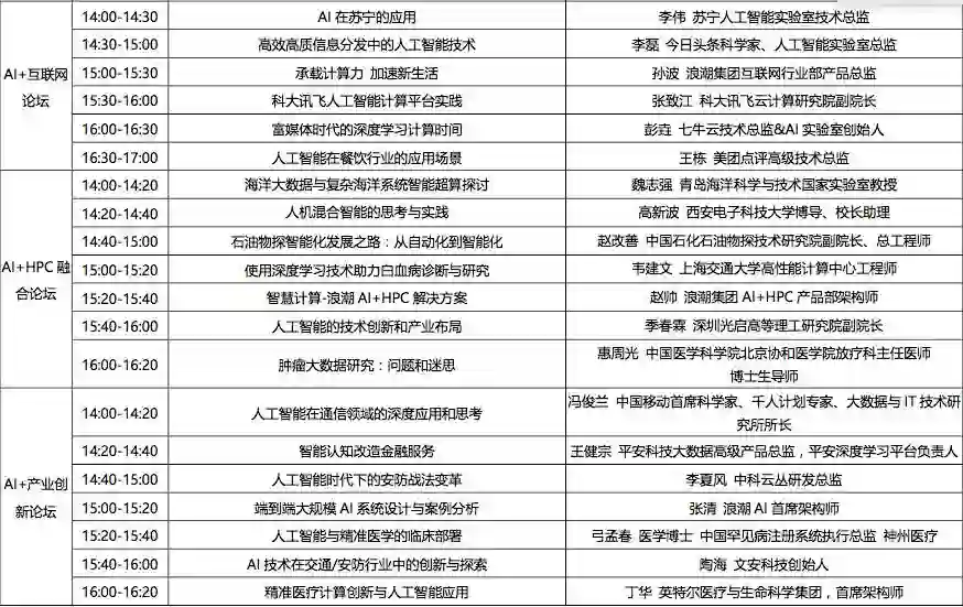 专业论坛将重点分享如何更好利用计算推动AI重构行业,包括AI+计算创新、AI+互联网、AI+HPC融合和AI+产业创新等四大论坛。英特尔、英伟达、浪潮、阿里、腾讯、科大讯飞、今日头条、苏宁、中国移动、中国石化、平安科技等业界领先的AI公司的专家,将分享各领域的AI技术与应用进展。