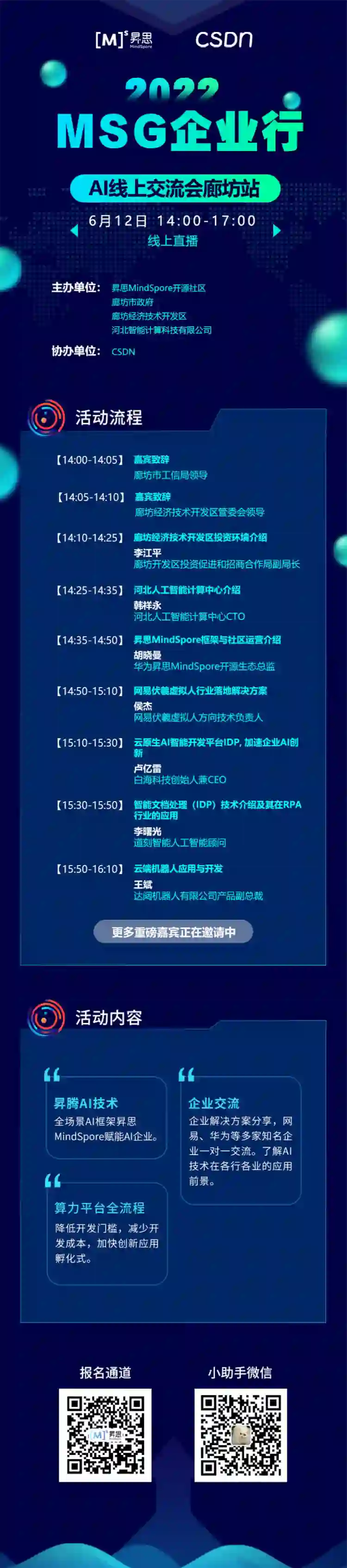 2022年6月12日(周日),昇思MindSpore开源社区联合廊坊工信局、廊坊开发区、河北人工智能计算中心共同举办【MSG企业行·廊坊站】线上交流会。
