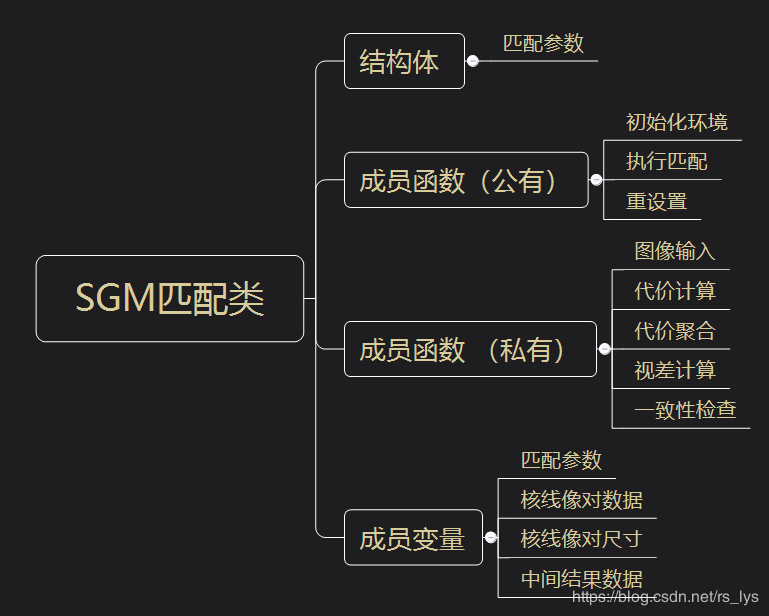 框架的解释:既然是基于C++,那肯定是以类的方式,咱们把SGM匹配当做一个对象类,匹配所需要的数据和参数为成员变量,匹配所执行的步骤当做成员函数,这里分为公有和私有,公有成员函数是调用层可调用的接口,我开放了三个:初始化、执行匹配以及重设置,这当然是调用层所喜欢的方式,完成功能的前提下调用越简单越好。具体的算法步骤我放到私有成员函数里,表示这些接口调用层不需要关心,而算法层需要包装成接口以让代码逻辑清晰而整洁。当然,如果是实际工作中,我的建议是:外面再以类的方式封装一个接口层,让调用者只能看到两个公有函数,其他全部看不见,这样可以做到算法保密,而简洁的接口调用者也用的方便舒心。(见此前博客C++学习 | C++ Implement的使用)