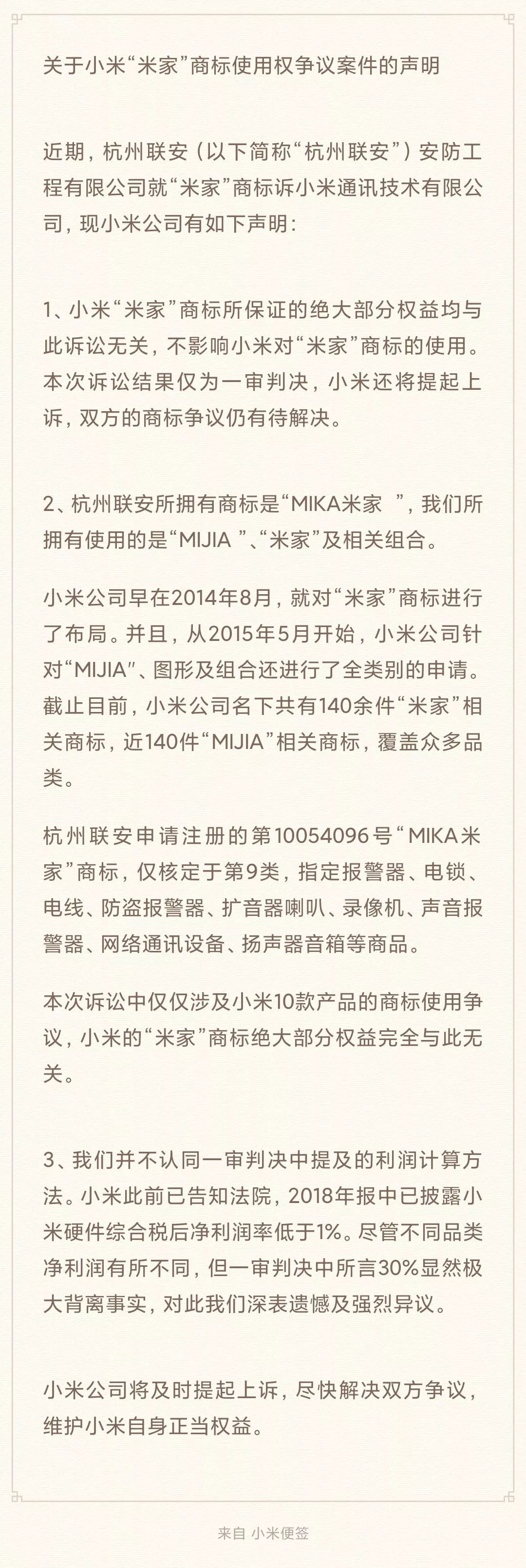 小米回应“米家”商标争议:不影响商标使用,将提起上诉