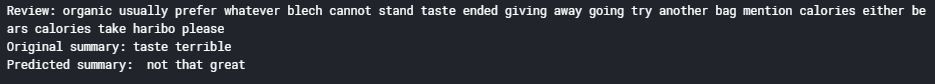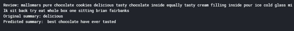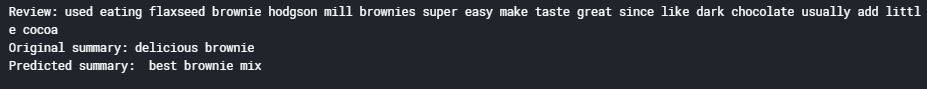 4. print("Predicted summary:",decode_sequence(x_val[i].reshape(1,max_len_text)))