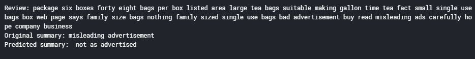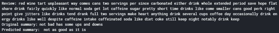 这真的很酷。即使我们模型生成的摘要和实际摘要并不完全匹配,但它们都传达了相同的含义。我们的模型能够根据文本中的上下文生成清晰的摘要。
