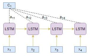 参与的上下文向量C1由编码器隐藏状态hj和对齐分数a1j的乘积的线性和导出: