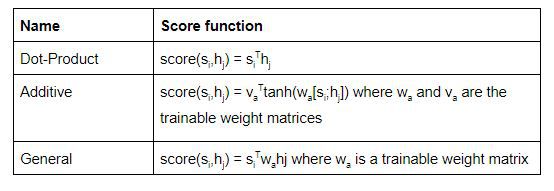 根据所使用评分函数的类型,存在不同类型的注意力机制。我在下面提到了一些流行的注意力机制:
