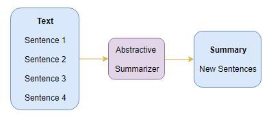 这是一个非常有趣的方法。当中,我们会从原文中生成新的句子。这与我们之前看到的抽取方法形成了对比,之前我们只使用了现存的句子。通过生城式摘要生成的句子可能并未出现在原文中: