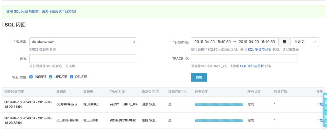 DRDS SQL 闪回针对上述数据行级的误操作场景,提供精确到特定 SQL 的数据恢复能力。用户仅需提供误操作 SQL 的相关信息,即可针对该 SQL 生成精确的回滚SQL(或原始 SQL)文件,用户下载后根据需求恢复数据。