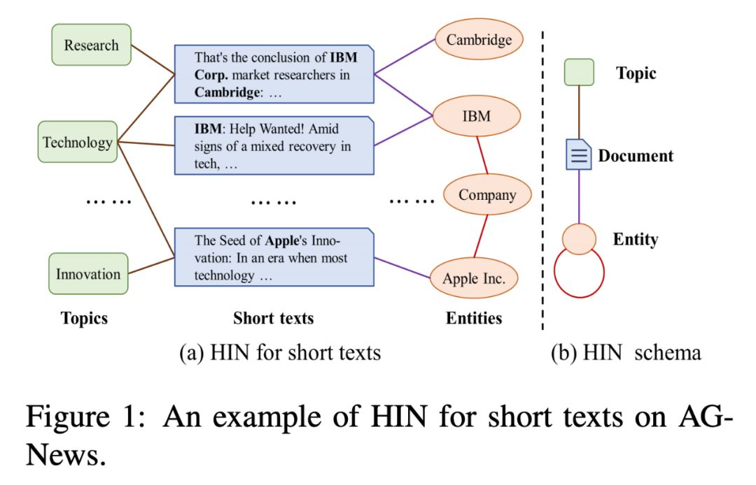 针对短文本分类的稀疏/歧义和标签稀缺问题,通过将其建模为异质图来解决数据稀疏和歧义带来的挑战。下图是作者在 AG-News 数据上建⽴的异质图。