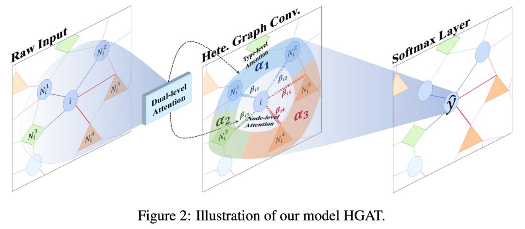 同时,本文提出了⼀种异质图注意力 HGAT 来学习短文本的表示并进⾏分类。HGAT 也遵循异质图神经网络的层次聚合,并且利用层次注意力机制来实现更好的信息聚合。模型架构⻅:
