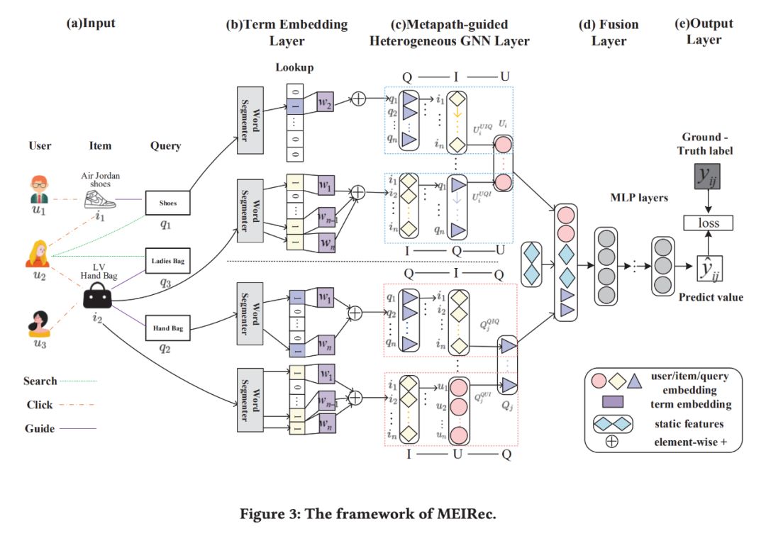 本文所提出的 MEIRec 的核⼼思想是:设计⼀个异质图神经网络来学习 user 和 query 的表示。这里的异质图神经网络也遵循经典的层次聚合⽅式。下图展示了 MEIRec 的整个算法框架。