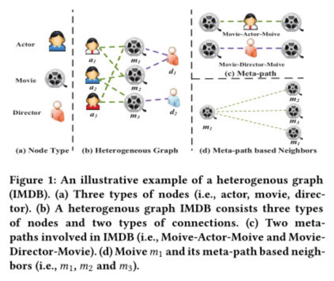但真实世界中的图大部分都可以被自然地建模为异质图(多种类型的节点和边,如下图所示,IMDB 数据中包含三种类型的节点 Actor、Movie 和 Director,两种类型的边 Actor-Moive 和 Movie Director)。多种类型的节点和丰富的语义信息给异质图神经网络设计带来了巨大挑战。