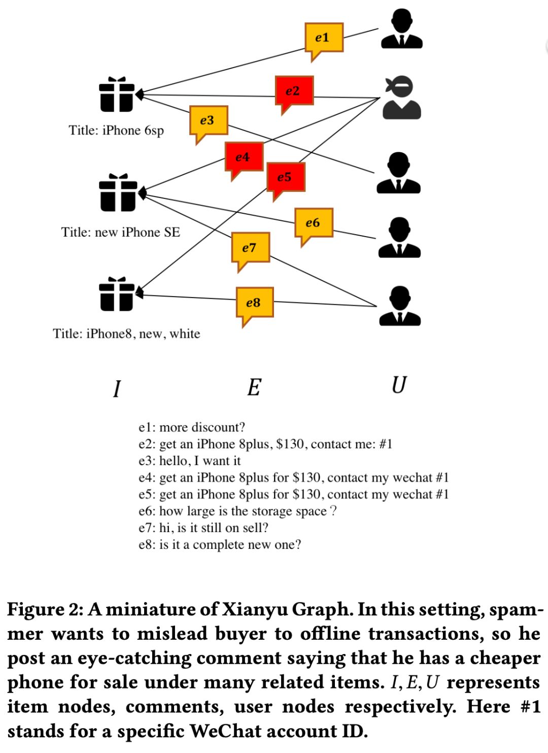 作者将闲⻥上的恶意评论建模为⼀个大规模异质图(如下图所示),提出了⼀种 GCN-based Anti-Spam (GAS) 模型,可以实现⾼效准确的垃圾评论检测。由于这里的图数据实际上只有 User-Item 之间的⼀种关系,GAS 模型并没有遵循异质图神经网络经典的层次聚合,只选取了⼀种元路径(User-Item)在节点层⾯来聚合邻居信息。