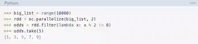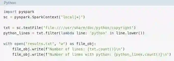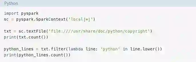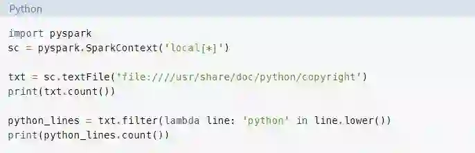 在本指南中,你将只了解处理大数据的核心Spark组件。然而,所有其它组件,如机器学习、SQL等,也都可以通过PySpark在Python项目中使用。