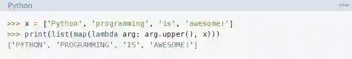 for循环的结果与map()示例相同,后者中收集了所有项的大写形式。但是,与filter()示例一样,map()会返回一个iterable,这再次使得它可以处理无法完全装入内存的大数据集。