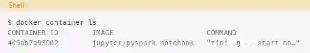 这个命令将显示所有正在运行的容器。找到运行jupyter/pyspark-notebook镜像的容器的CONTAINER ID,并使用它连接到容器内的bash shell: