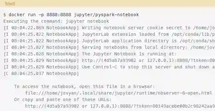 现在你有一个容器来运行PySpark了。注意,docker run命令输出的末尾提到了一个本地URL。