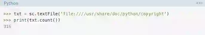 创建RDDs的另一种方法是使用textFile()读入一个文件,你在前面的示例中已经看到了该方法。RDDs是使用PySpark的基本数据结构之一,因此API中的许多函数都会返回RDDs。