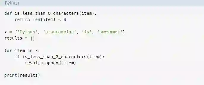 这段代码会收集所有少于8个字符的字符串。代码比filter()示例更冗长,但是它执行的是相同的函数,得到是相同的结果。