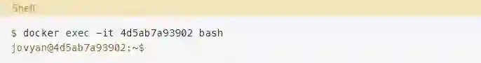 现在你应该连接到容器内部的一个bash提示符了。你可以确认一切正常,因为你shell的提示符将变为类似于jovyan@4d5ab7a93902的东西,但是使用的是你的容器的唯一ID。