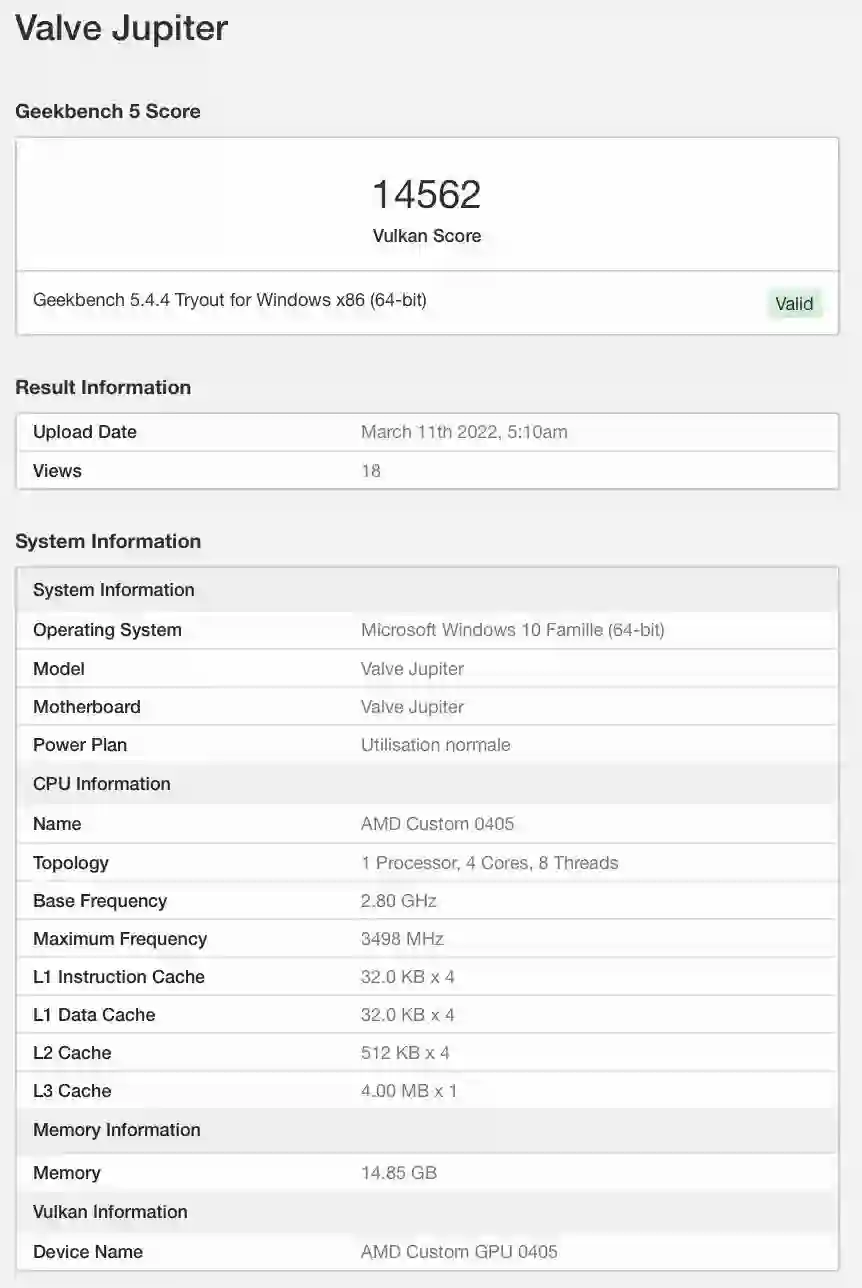 目前,在 Geekbench 上,已经能够找到 Steam Deck 在 Win10 下的 CPU 跑分成绩。从跑分结果给出的信息来看,Steam Deck 的处理器代号为 AMD Custom 0405,跑分成绩为 14562 分。与 Geekbench 的跑分排名对比,Steam Deck 的性能稍高于英伟达的 MX350 以及英特尔的 Xe 核显,已经能够运行一些规模不大的游戏。