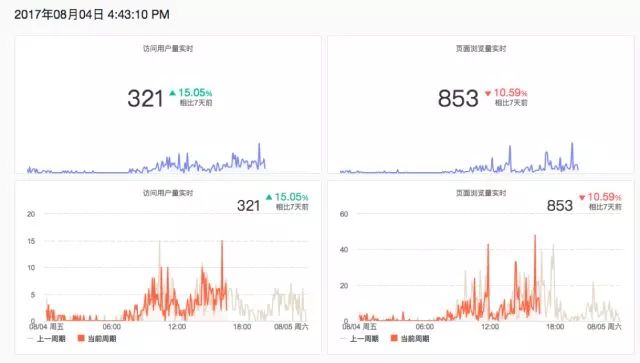 对于电子商务网站,流量是非常重要的指标。上图中,我们将网站的访问用户量(UV)和页面浏览量(PV)等指标汇汇聚到统一的数据看板(Dashboard),并且实时更新。这样的一个数据看板,核心数字和趋势一目了然,对于我们来说一目了然。