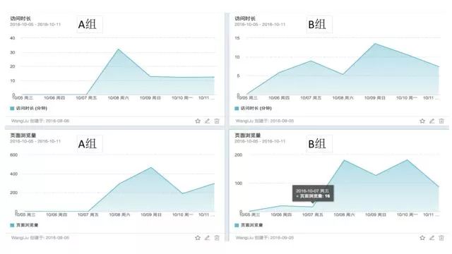 举个例子,我们设计了两种不同的产品交互形式,通过比较实验组(A 组)和对照组(B 组)的访问时长和页面浏览量两个衡量指标,来评估哪一种交互形式更佳。