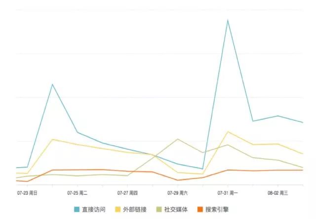 举个例子,当监测到网站流量异常时,可以通过拆分地区、访问来源、设备、浏览器等等维度,发现问题所在。图 7 中,当天网站的访问用户量显著高于上周,这是什么原因呢?当我们按照访问来源对流量进行维度拆分时(图 9 ),不难发现直接访问来源的访问量有非常大的提升,这样就进一步把问题聚焦了。