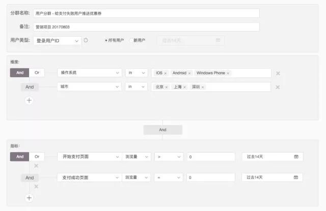 在数据分析中,我们往往针对特定行为、特定背景的用户进行有针对性的用户运营和产品优化,效果会更加明显。上图中,我们通过 GrowingIO 的用户分群功能将一次促销活动中支付失败的用户挑选出来,然后推送相应的优惠券。这样精准的营销推广,可以大幅度提高用户支付的意愿和销售金额。