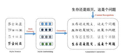 图 1:基于我们的方法的汉字生成过程描述。给定少量特定字体的样本(例如签名),我们推理不同字体的隐藏向量。然后,我们通过识别它们的内容在少量样本的基础上生成中文字体(「生存还是毁灭,这是个问题」),可以看到,用来训练的样本中,每个风格只有四个汉字(「莎士比亚」)。