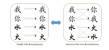 图 6:Vanilla 变分自编码器和我们的交叉逐对训练的对比:实线和虚线分别代表风格提供者和内容提供者。