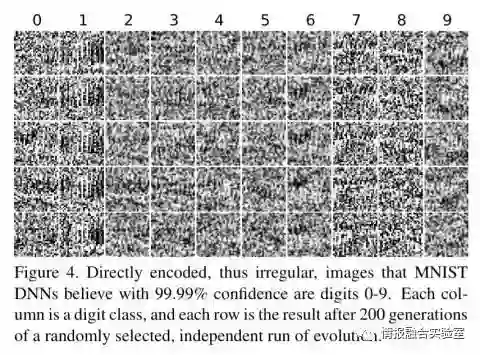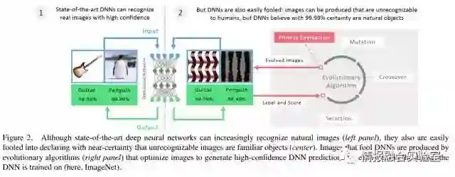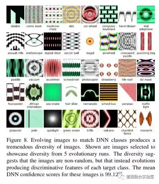 你所看到的是对抗图像,而不再像从人的角度来看到的目标类别。显然,DNN并没有与我们以相同的方式学习解释图像。对抗图像是使用进化算法(EA)创建的,标准EA使用单一的适应度函数,但是作者使用MAP-Elites的新算法,并测试了两种不同的突变策略。