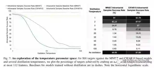 以这种方式训练网络,有助于更好的泛化。下图展示蒸馏温度如何影响模型对抗样本的防御能力。直观上,温度越高防御越好。