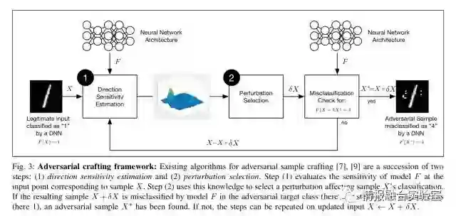 下面介绍防御性蒸馏如何工作以及其原理。考虑一般的对抗框架,首先搞清楚工作方向是围绕给定的输入样本,然后使用这些信息选择输入维度之间的扰动。
