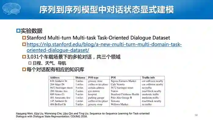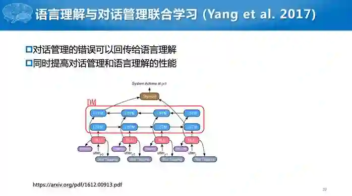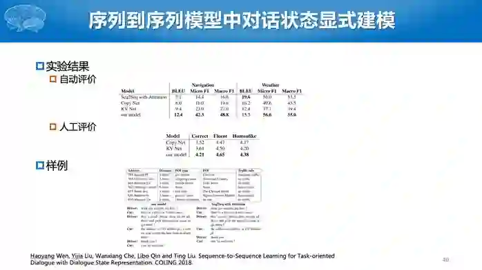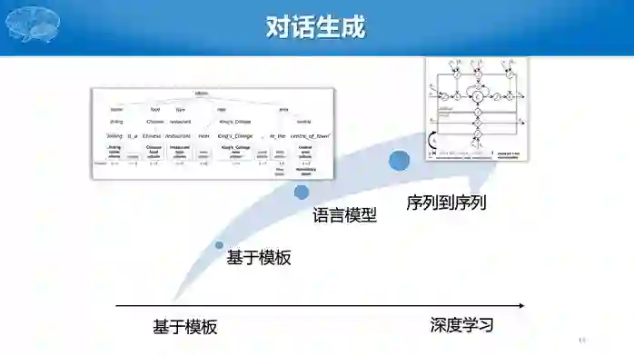 最后是对话生成,通常采用基于模板的简单方法,也可以采用语言模型,目前也出现了基于深度学习的模型。与之前基于序列到序列的深度学习模型不同,这里采用的是状态到序列的模型。基于深度学习的模型还多处于研究阶段,实际应用中还是多采用基于模板的方法。