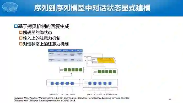Eric and Manning (2017)直接使用序列到序列的模型,从用户的提问生成相应的回复。针对任务型对话,传统的序列到序列模型有一个明显的问题,就是我们不能简单地从历史对话数据中学习,比如问“明天天气怎么样?”如果训练数据有回复说“晴天”,但是不能每次都一样的回答,需要根据当前天气预报数据进行回复。所以在他们的工作中,生成的词有两个来源,一个数据库,如“晴天”或者“阴天”,第二就是从原始文本中拷贝过来。