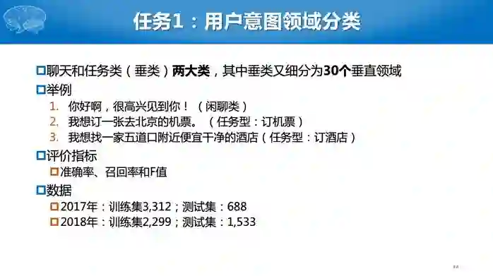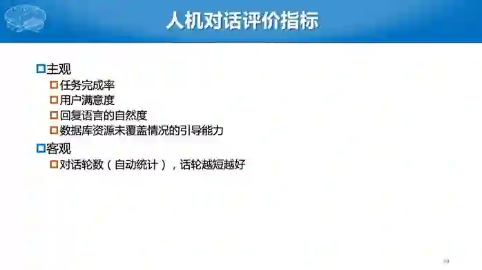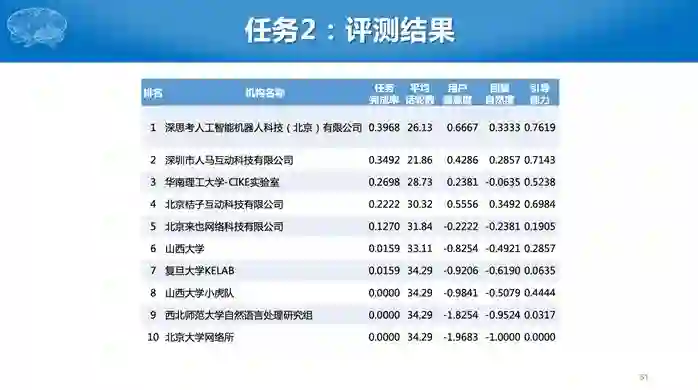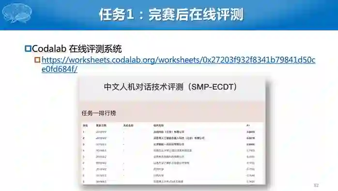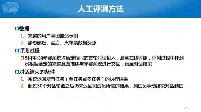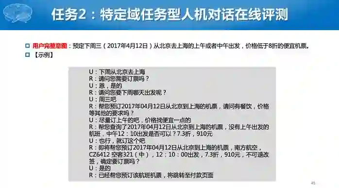 第二个任务比较难,参赛单位需要构建一个完整的对话系统,对于同一个用户输入,有很多种可能的输出,到底哪个输出好,现在机器比较难评价。因此我们采用了人工评测的办法。有一个真实的评测人员,给所有的系统统一的初始输入,然后针对每个系统的回复继续进行对话,若干轮后给出评价。评价有几个指标,包括用户满意度、回复自然度等主观指标,还有对话轮次等客观指标,对话轮数是越少越好。