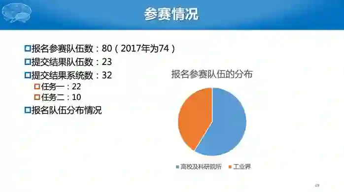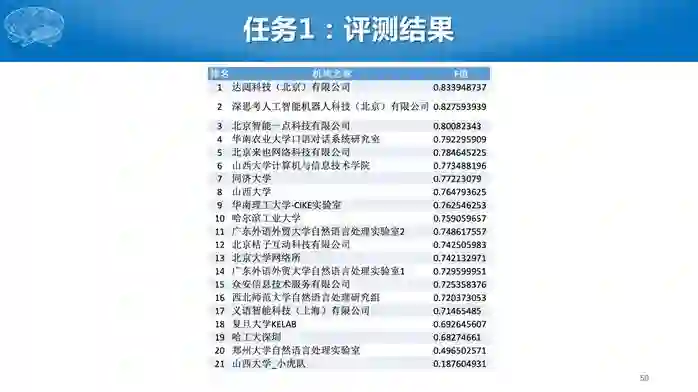 最终共有80支队伍参赛,工业界和高校等科研院所各占一半。任务一有20多个单位提交结果,任务二有10个单位提交结果。最终评测排名如下。