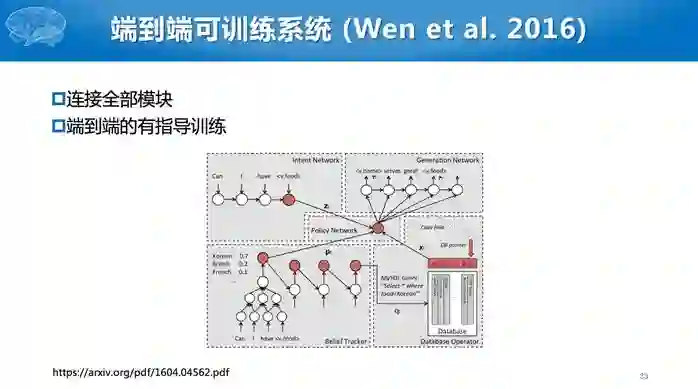 之前有一些相关的工作,如所谓的联合学习,就是将多个模块放在一起学习,这样可以减小错误级联的问题。Yang et al. 2017把对话管理模块和语言理解模块进行联合学习。Wen et al. 2016把更多的模块放在一起端到端的训练,包括语言理解、对话管理和对话生成。但是对于数据库的查询,仍然需要显式地转成SQL语句。