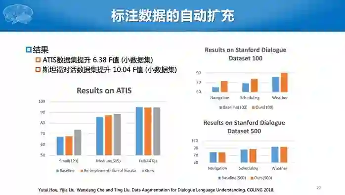 在使用对话技术平台时,目前一个最大的问题就是用户需要上传一些数据,但是数据量往往非常少,如何在少量数据的情况下提高对话能力呢?假设用户就上传三句话,并为这三句话标注了一些槽,我们希望能通过这三句话改写成更多语义相同,但是表达形式不一样的句子。这其实是数据增强,在图像里面也有类似的想法,我们可以对原始的图像进行旋转或者平移的操作,构造更多的训练数据。但是即使只对语言稍微替换一个字母,意思也不一样了。所以对语言的数据增强难度更高。此处,我们将同一意图下的多个句子两两构造成互为复述的句对,然后使用Seq2Seq模型学习如何生成新的数据。最终将原始的训练数据,扩展成更多的数据。当训练数据比较少时,如只有几十句或者几句,提升的效果非常明显。