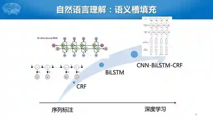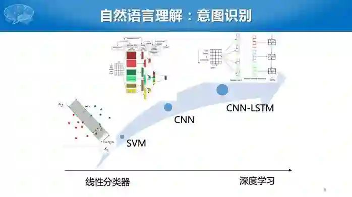 下面介绍这几个模块的技术发展趋势。其中,意图分类可以看成是文本分类,而且是短文本分类问题。早期采用SVM等线性分类器,最近主要采用深度学习方法,比如CNN或者CNN-LSTM。有人说深度学习需要大数据,对话领域数据不多,为什么还采用深度学习技术呢?这主要归功于预训练模型,使得深度学习在只有较少数据的情况下,仍然可以取得比较好的效果。