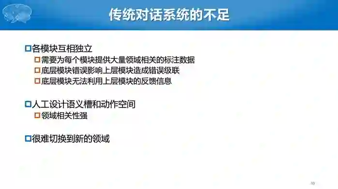 另外,传统的对话系统还有一些不足。首先,各个模块之间都是相互独立的,这样我需要为每个模块去标注大量的数据,特别是跟领域相关的数据;底层模块的错误会影响上层模块,如果语言理解错了,就会影响到对话的管理,这也叫错误的级联;上层模块信息无法反馈到下层模块。其次,针对每个领域都需要人工设计语义槽,动作空间也都不一样,导致系统的设计跟领域非常相关,很难切换到新的领域。